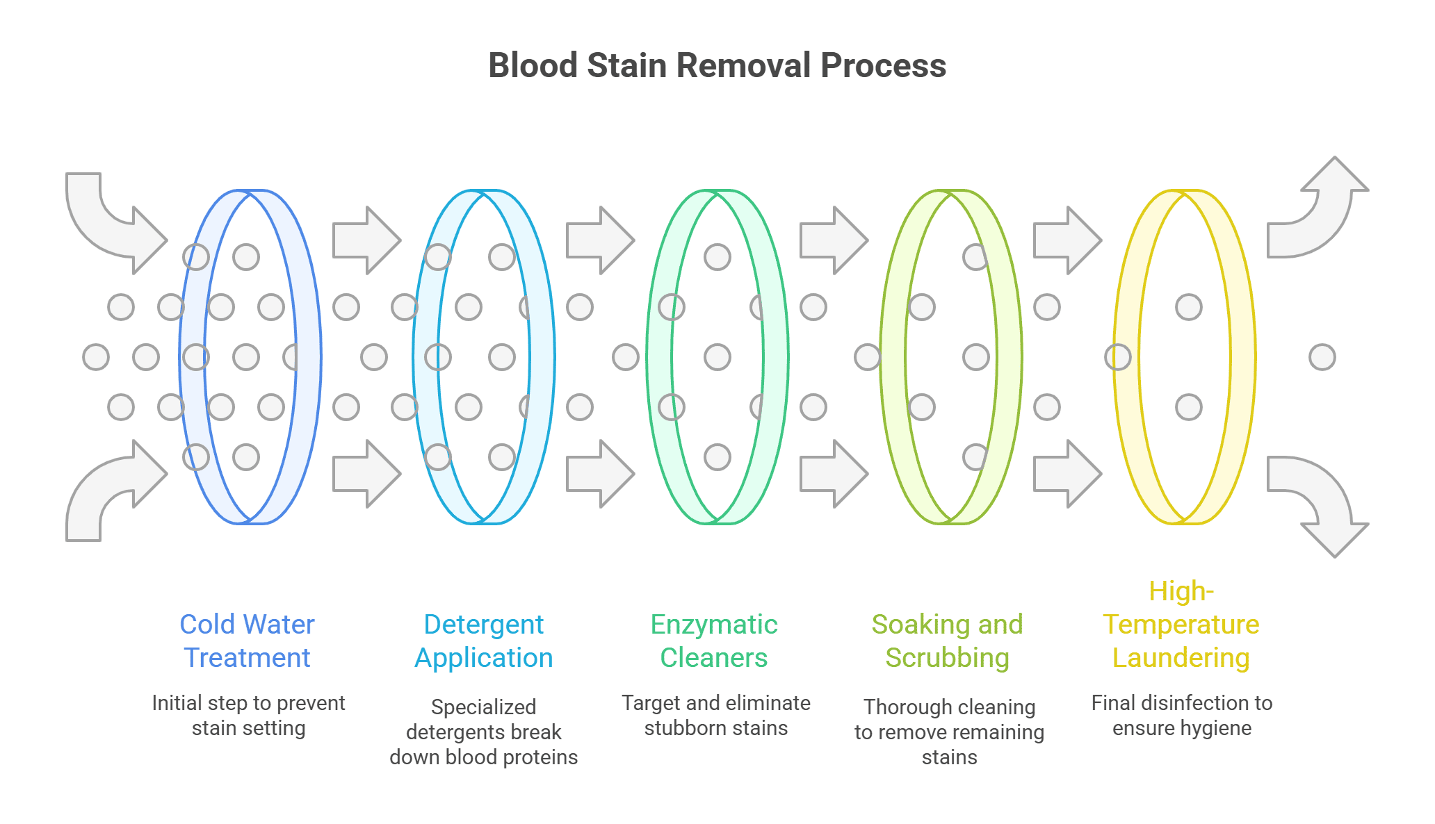 Prefers a pre-soak with an enzyme-based cleaner that breaks down proteins in the blood, commonly used by hospitals. This enzymatic cleaner performs a function equivalent to small, microscopic laborers who break down the blood proteins into much smaller, more easily removable compounds. Such enzymatic cleaning agents are designed to target specific blood components such as hemoglobin, breaking them down before they even reach the washing cycle.