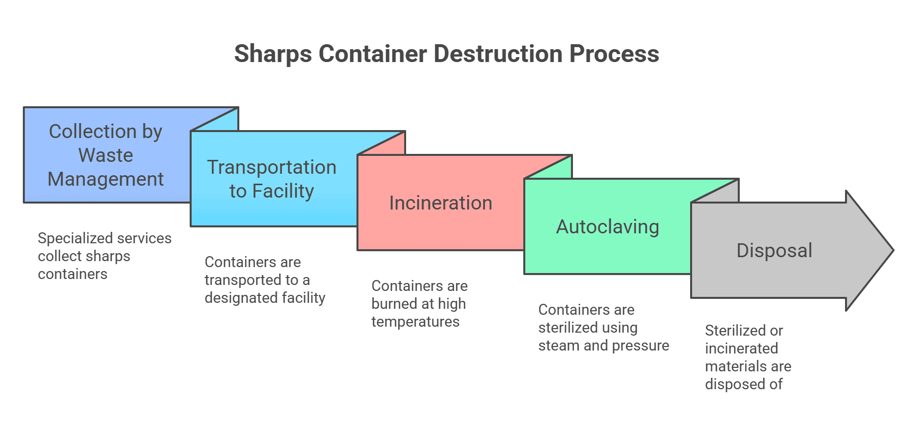 Autoclaving has widely appeared as one of the most effective and reliable methods for handling sharps waste. It is used by most medical waste disposal offerings because it’s efficient and guarantees that sharps containers are adequately sterilized and made non-hazardous.
