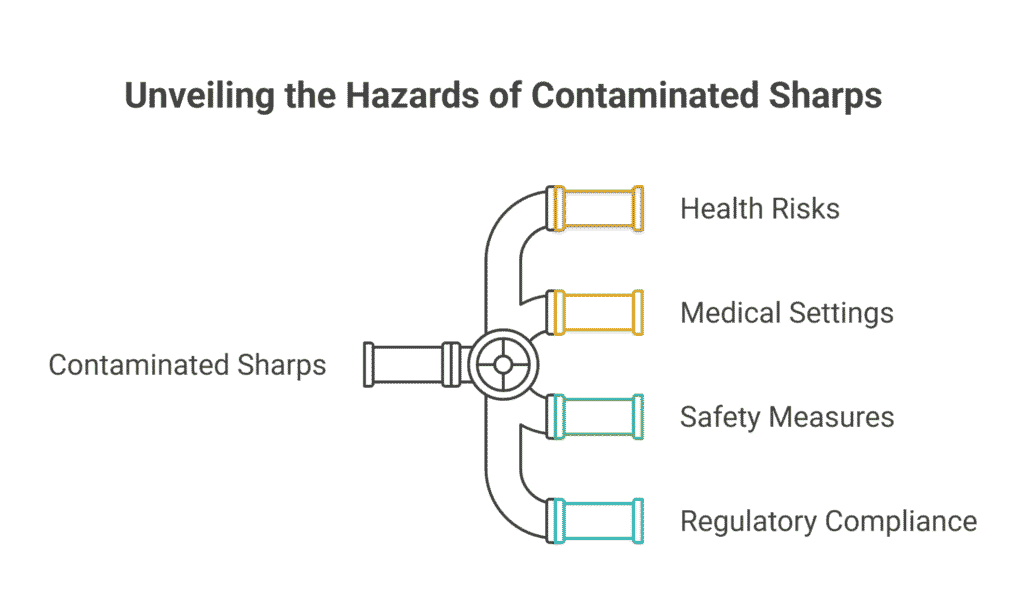 A contaminated sharp is a sharp object that has encounter biohazards such as blood, bodily fluids, or other infectious materials. Examples include needles, scalpels, razor blades, and broken glass from medical or laboratory settings. These items pose significant health risks as they can transmit serious infections like HIV, hepatitis B, and hepatitis C if not handled properly. Safe disposal in puncture-resistant containers is essential to prevent injuries and disease spread. Understanding what is a contaminated sharp help ensure proper medical waste management, protecting both healthcare workers and the public from potential health hazards.
